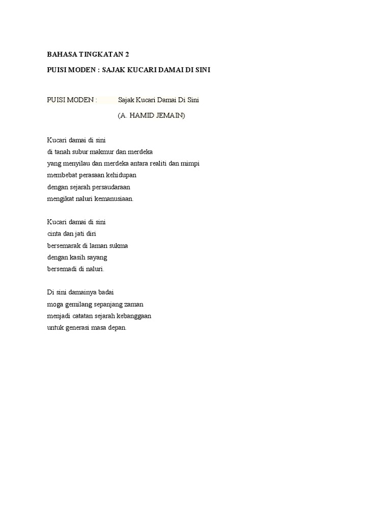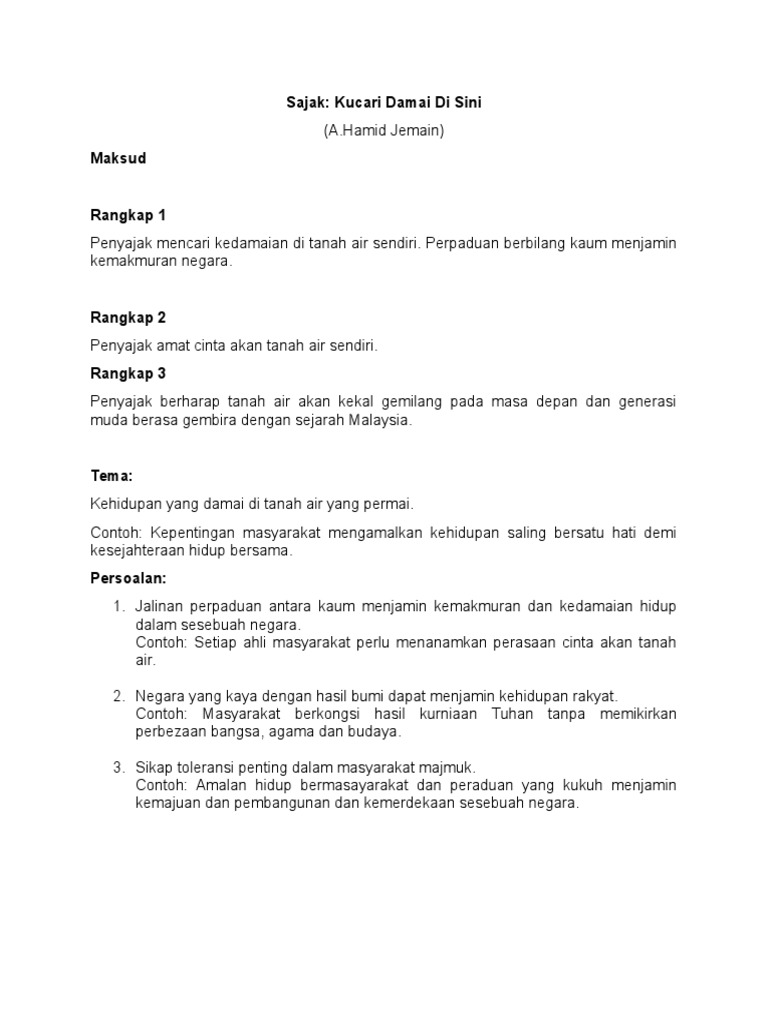 Berdasarkan sajak di atas terdapat banyak pengajaran yang kita dapat pelajari pilih dua pengajaran yang terdapat dalam. Kuiz Pengukuhan Sajak Ku Cari Damai Di Sini. Kita hendaklah berusaha untuk terus memajukan negara.