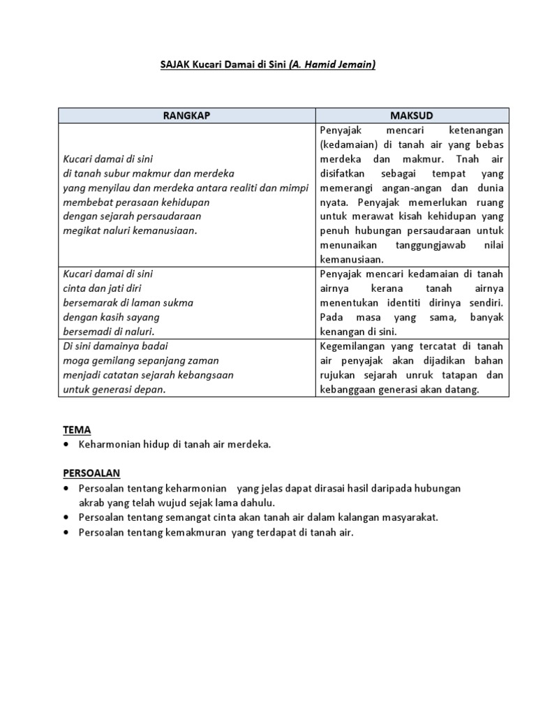 Sajak kucari damai di sini MAKSUD SAJAK PERSOALAN NILAI DAN PENGAJARAN ID. Di tanah subur makmur dan merdeka.